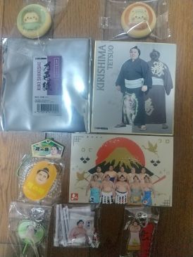 初場所観戦に行った女性に頂いた大相撲グッズ。上の2つはお礼に 渡した八景島クッキー。 |