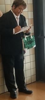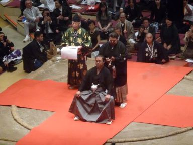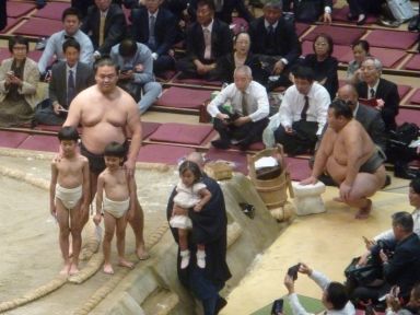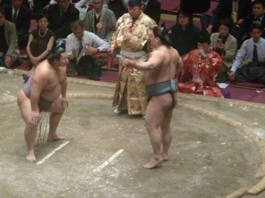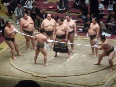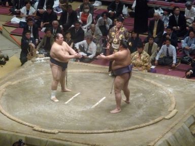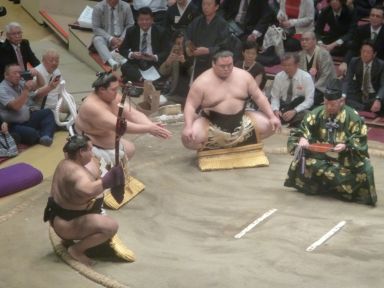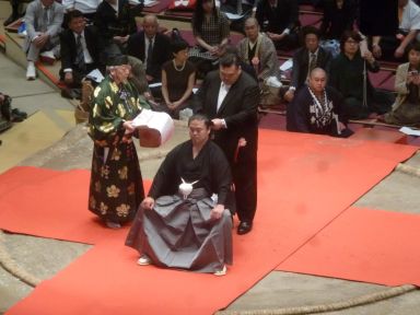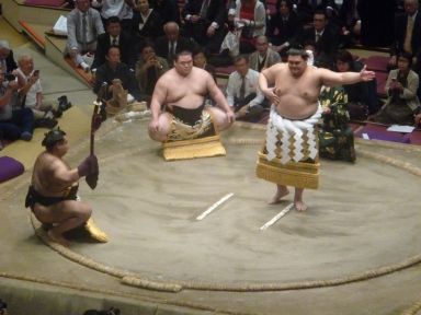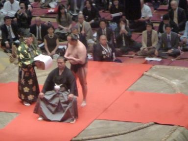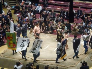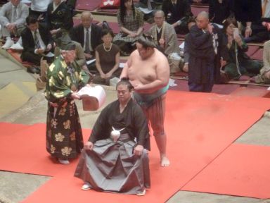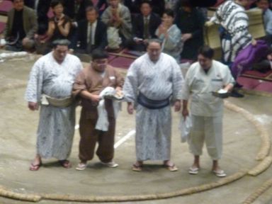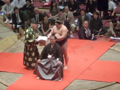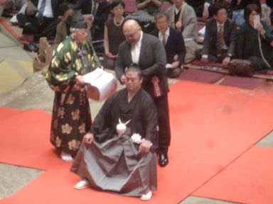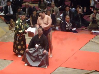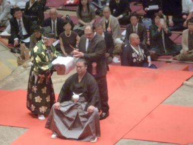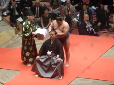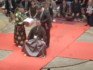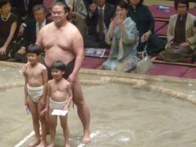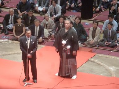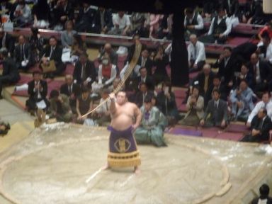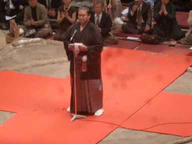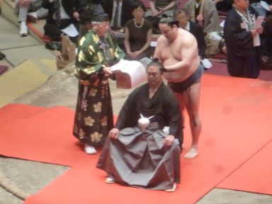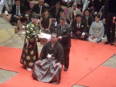 錦富士関 横浜市出身の荒篤山関 剣翔関 嘉陽関 千代翔馬関 席は初のイスA席。 トークイベントの時に御本人から購入したので、自分の直前に購入した トークイベント常連の男性と隣の席なのは分ってたんですが、 まさかの階段を挟んで隣でした(笑)。でも、お互い一人だったので少しお話は出来ました。 トークイベントと言えば主催のマリソルミュウのお二人と1階の通路ですれ違って 声を掛けてもらったんですが10秒ぐらい経ってから気付きました…。 何故か外国人客が多くて、1階に外人さん向けの案内コーナーまで設置されてました。 僕の席の周りもほとんど外人さんでしたが、楽しんでそうで良い感じでした。 十両取組 白熊 - 荒篤山 栃大海 - 三田 琴栄峰 - 千代翔馬 相撲甚句 妙義龍最後の一番 2人の息子さんと 髷結い実演 モデル : 平戸海、佐田の海 実演者 : 床隆、床輝 ご挨拶 学校法人 日本体育大学 理事長 松浪健四郎さん |