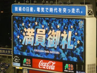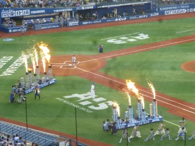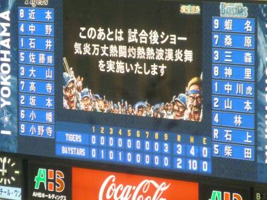 | もちろん超満員です。 7回裏1死2塁の場面で代打オースティン選手。 ケイ投手の素晴らしい投球と筒香選手の2打席連続ホームランで8回までは完全に ベイスターズの勝ち試合でしたが、阪神の9回の攻防は凄かったです。 今季は抑えを務める入江投手。 9回表、先頭の近本選手はショートゴロ。 阪神・藤川監督は3回リクエストして成功1回、失敗2回でした。 2番・中野選手はショートへの内野安打、3番・森下選手はセンター前ヒットで 1死1・3塁。4番・佐藤輝明選手はセンターへの犠牲フライで1-2。 そして、5番・大山選手がライトスタンドへの逆転2ランホームラン! レフトスタンドへの大声援に答える大山選手。 9回裏、NPB記録の42試合連続無失点継続中の石井投手が登板。 代打は元中日のビシエド選手。 柴田選手の送りバントで1死2塁。蝦名選手は死球、桑原選手はレフトへのヒット。 1死満塁。阪神は大ピンチ。 三森選手のセンターに抜けるかと思われたライナーを 前進守備のショート小幡選手がスーパーキャッチ! 神里選手も良い当たりでしたがセンター近本選手が捕って試合終了。 ヒーローインタビューはもちろん大山選手。 ショーは少しだけ見ました。 この3連戦は“男祭り”で角田信朗さんが試合前・試合中・試合後 パフォーマンスで大活躍!試合前には国歌独唱も行いましたが歌も上手いです。 |