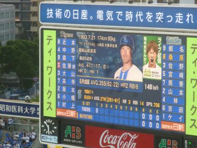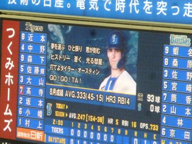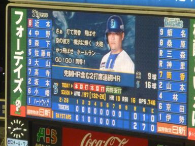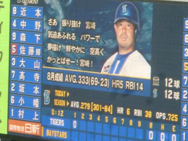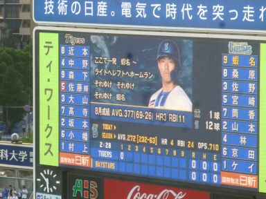 | TUBEのライヴ以来3日ぶりに横浜スタジアムに行って来ました。 今月だけで4回目の関内です。 守備につく筒香選手。スタメン出場は嬉しいです。 8月絶好調の蝦名選手。 桑原選手も8月絶好調。 阪神の先発は村上投手。 宮崎選手も8月絶好調(8月好調の選手が多い割にはチーム成績はイマイチ)。