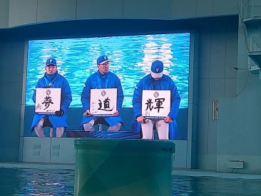 今年の抱負を表す漢字一字も発表。 相川監督は「道」。 石田投手は「夢(+ありがとう)」 素晴らしいセンスだと思いましたがオリジナル作ではないそうです(笑)。 度会選手は「輝」。 あえて光と軍を離して書いたそうです。 最後はベイスターズ球団歌「熱き星たちよ」バージョンのイルカショー。 相川監督の合図でスタート。 午前中見たイルカショー以上に凄かったです。 監督&両選手の決意表明も良かったです。 終演後、フォトスポットが設置されてました。 こんなに長時間八景島に滞在したのは初めてです。 でも、大相撲千秋楽の幕内優勝に関わる取組までには余裕で家に帰れました。 |